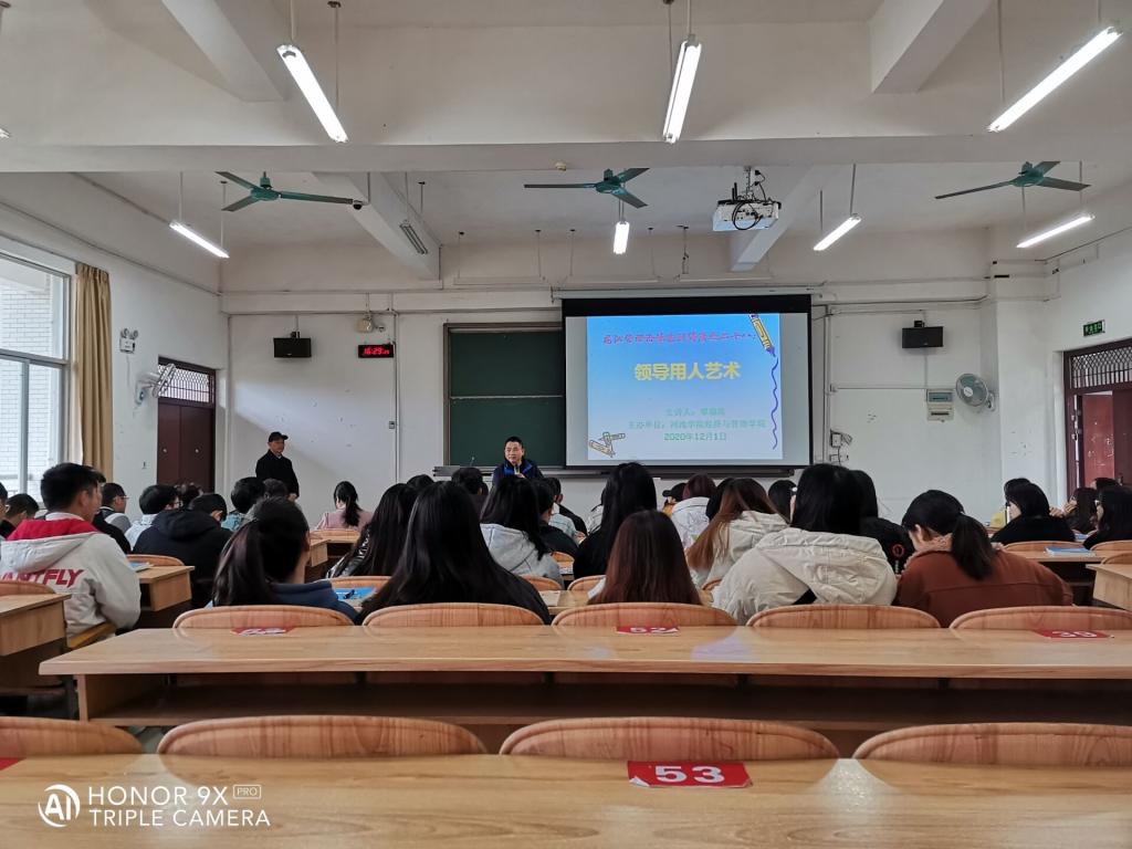 12月1日下午,经管学院在弘毅楼2-102举行“领导艺术”专题讲座。本次讲座由覃福珠主讲。我院副院长谭玉龙、专业教师蔡霞以及部分专业学生聆听了此次讲座。