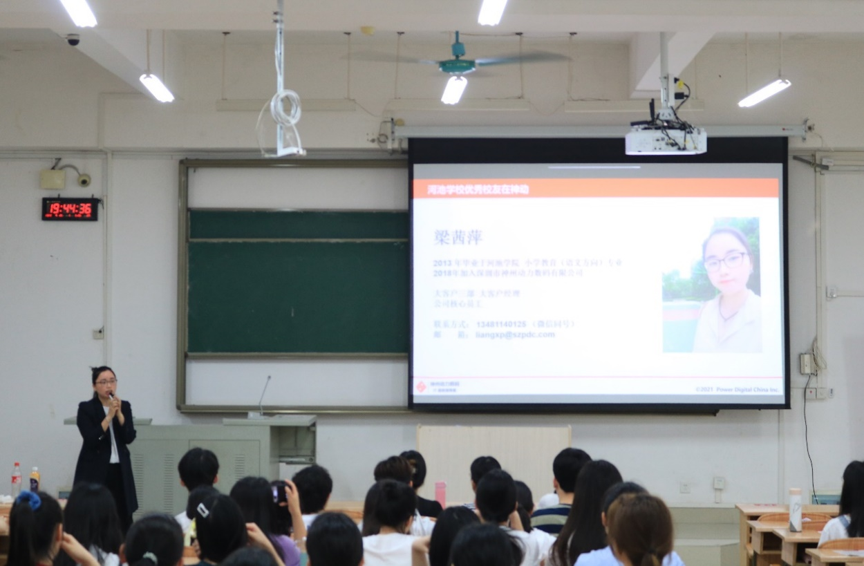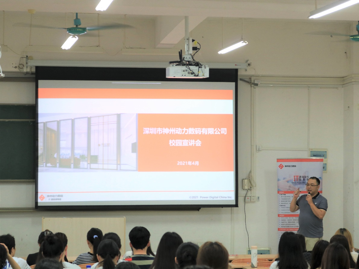 会上,深圳市神州动力数码有限公司就公司情况、企业文化、公司环境、招聘流程和晋升程序等方面与同学们进行交流,并开展现场答疑互动环节。该公司核心员工梁茜萍(我校09级毕业生)在会上鼓励同学们积极参加面试,把握锻炼与提升自我能力的机会。
