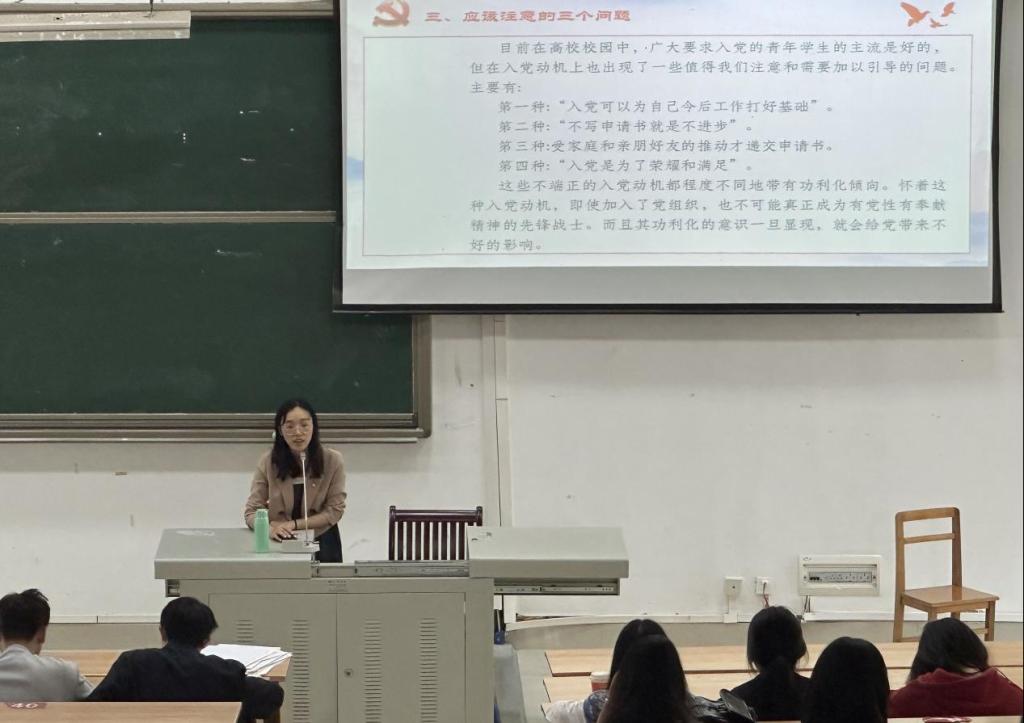 陈亚珍重点围绕习近平新时代中国特色社会主义思想和中国共产党党史,从党的基本知识、入党流程、入党动机、党员要求等方面为新生做了全面介绍。同时希望同学们能够正确认识到入党对自身的要求,端正入党态度,树立正确的入党动机,积极向党组织靠拢。