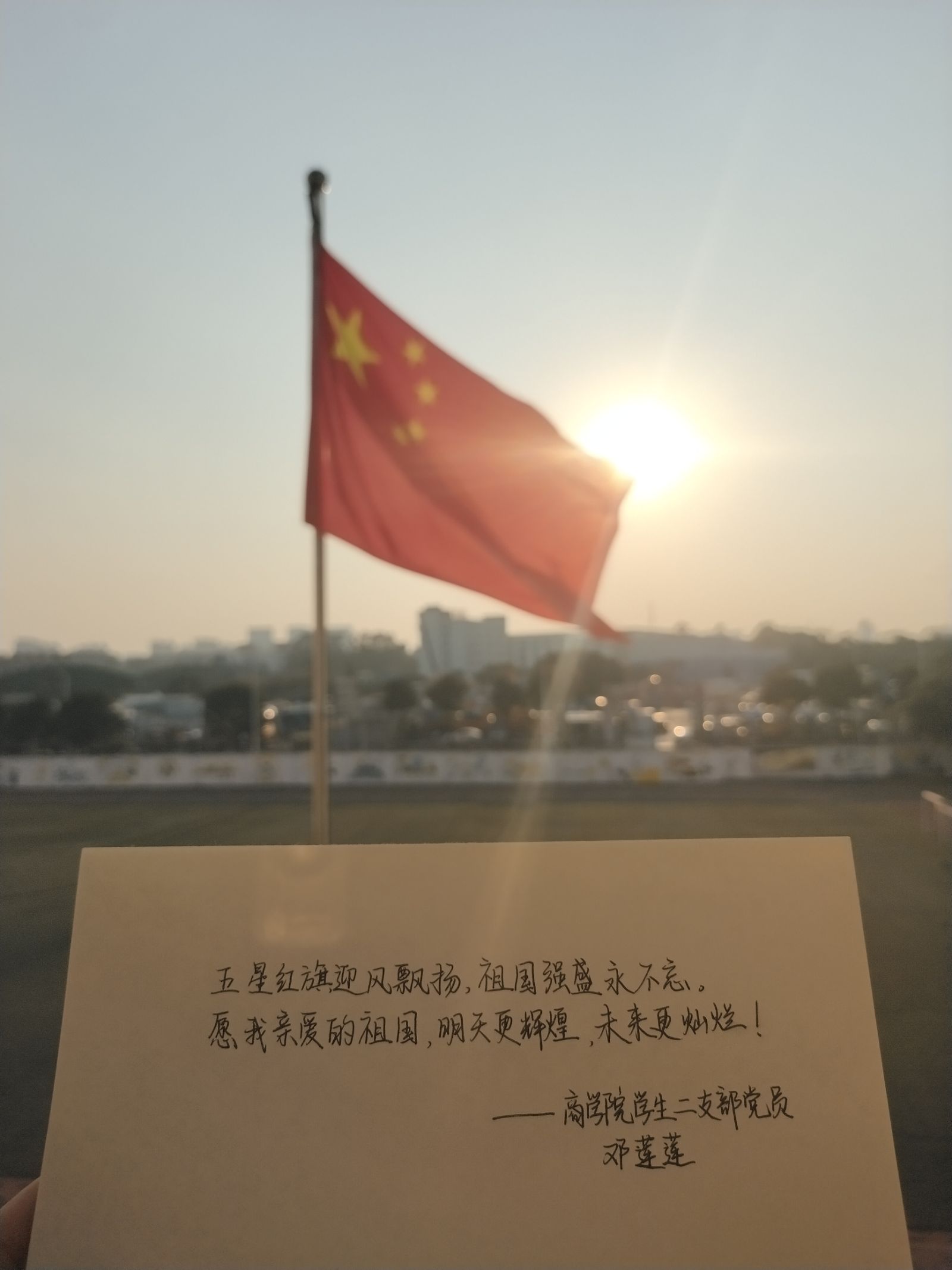 支部党员同志用合影表达对祖国母亲的由衷热爱和真挚祝福,将灿烂的笑容和鲜艳的五星红旗定格在镜头里并手写寄语倾诉对祖国的美好祝愿,将寄语拍照留存。