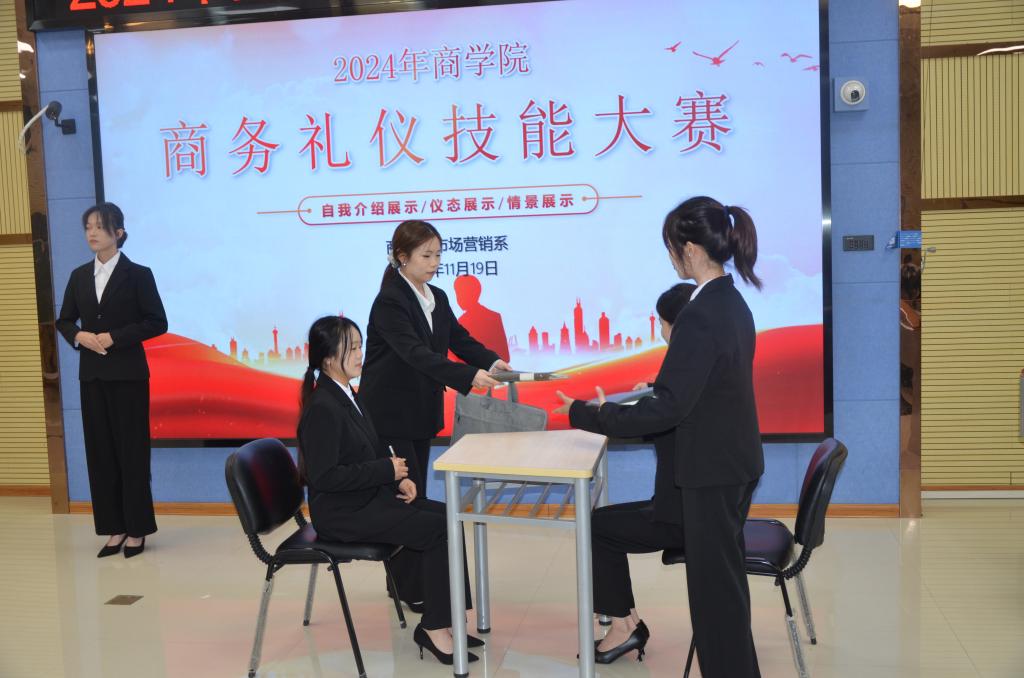 11月19日,2024年必威西汉姆联官网商务礼仪技能大赛在图书馆123未来教室成功举行。本次大赛由市场营销系主任刘蕙荟,市场营销系专业教师梁海东、陆涛担任评委,2023级市场营销专业学生贾妮娜主持,共有7支参赛队伍,大赛设一等奖一名,二等奖一名,三等奖一名,优秀奖一名。