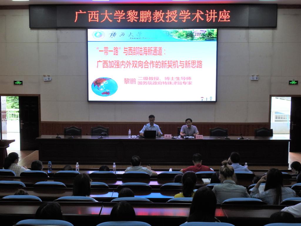 10月14日下午,广西大学黎鹏教授受邀在弘毅楼1-205报告厅作“一带一路”与西部陆海新通道:广西加强内外双向合作的新契机与新思路的学术讲座。我院党委书记韦书觉、院长覃举东、党委副书记龚丁海及部分专业老师、专业学生参加此次讲座。我院院长覃举东主持。