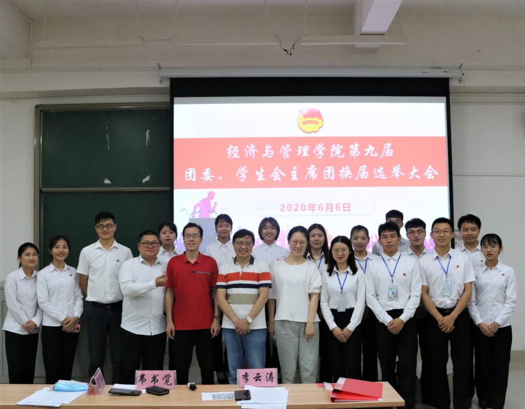 6月6日晚,经济与管理学院团委、学生会于弘毅楼2—103教室举行学院第九届团委、学生会主席团换届选举大会。学院党委书记韦书觉、党委副书记龚丁海、团委书记李云涛、辅导员王忠文出席此次大会,学院各班级代表、校团委学生会、社联、志联以及各二级学院代表参与此次大会。