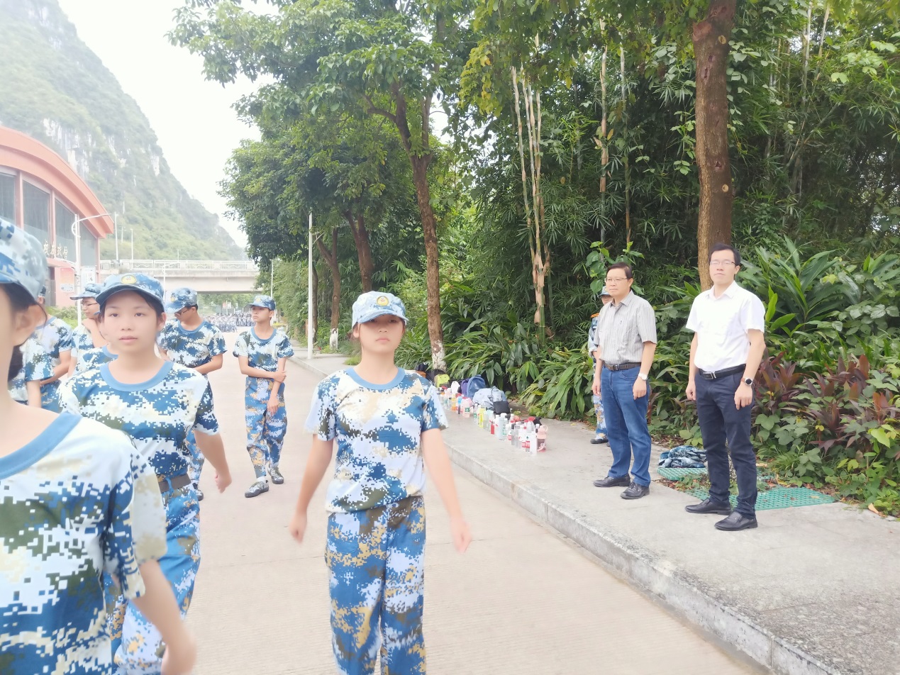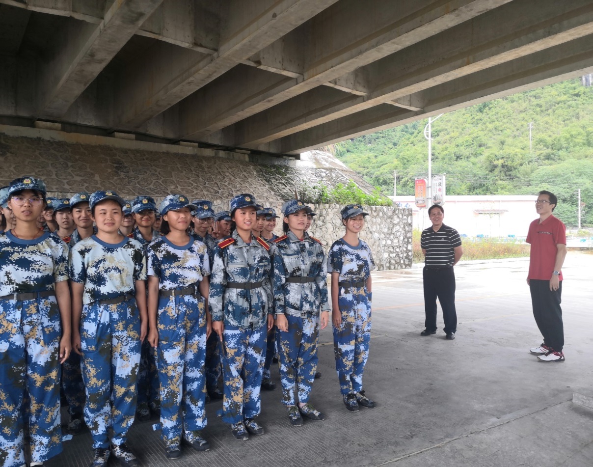 军训场上,韦书觉向参训新生表示亲切地问候,并勉励新生科学,文明,规范训练;树立正确的人生观,价值观。他表示,新生要把军训期间养成的良好品德和作风带到今后的学习生活中,为谱写美好的大学诗篇打下坚实根基。覃举东关切地询问新生在军训期间遇到的困难,并耐心地为新生排忧解难,希望新生继续发扬不怕苦不怕累的精神,坚持到军训的最后一刻。龚丁海对新生表示期望与关心,他希望新生在汇报表演时能取得好成绩,也祝他们的大学生活从军训开始一路高歌。