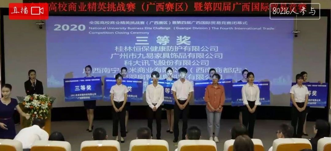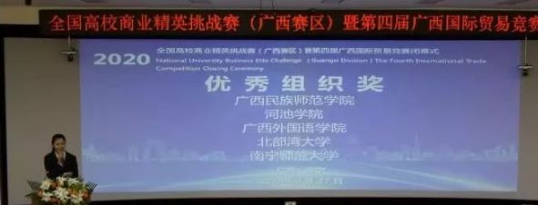 广西国际贸易竞赛是检验广西高校国际化商务人才教学改革成果,展示国际化商务人才通用技术和职业能力,考察参赛队的团队协作能力,提升综合素质,增强大学生的就业能力,培养可持续发展、满足企业需要的高素质高技能型人才。目前,广西等教育行政主管部门已将高校商业精英挑战赛国际贸易竞赛纳入本地区的学科竞赛计划。未来,我校将继续积极参与竞赛并再创佳绩。