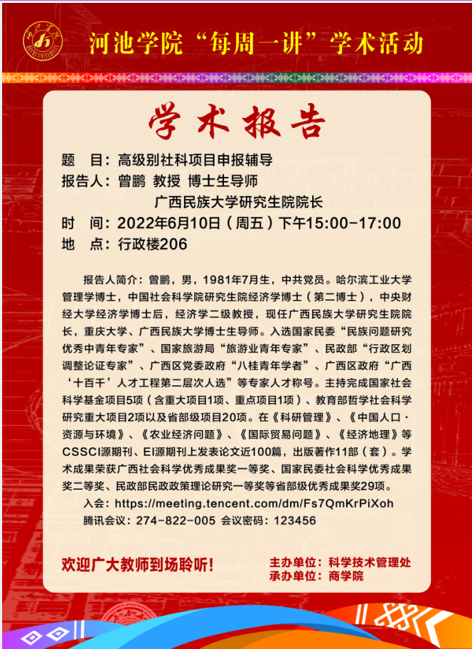 为加强国家社科基金申报的组织和指导,2022年6月10日下午,我院举办国家社科基金申报专题讲座。广西民族大学研究院长曾鹏教授受邀在行政楼206为必威西汉姆联官网教师做“国家社会科学基金项目申报技巧与艺术”的专题讲座。