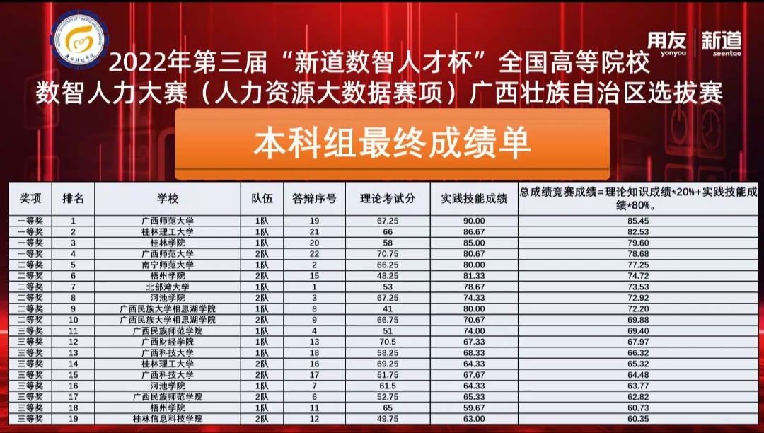 9月24日,由中国人力资源开发研究会智能分会主办的第三届“新道杯”全国高等院校数智人力大赛(人力资源大数据赛项)广西区赛顺利举办。我院人力资源管理专业学生组成两支参赛队在专任教师刘智、赵路、刘珊佑及黄子津的指导下取得优异成绩。