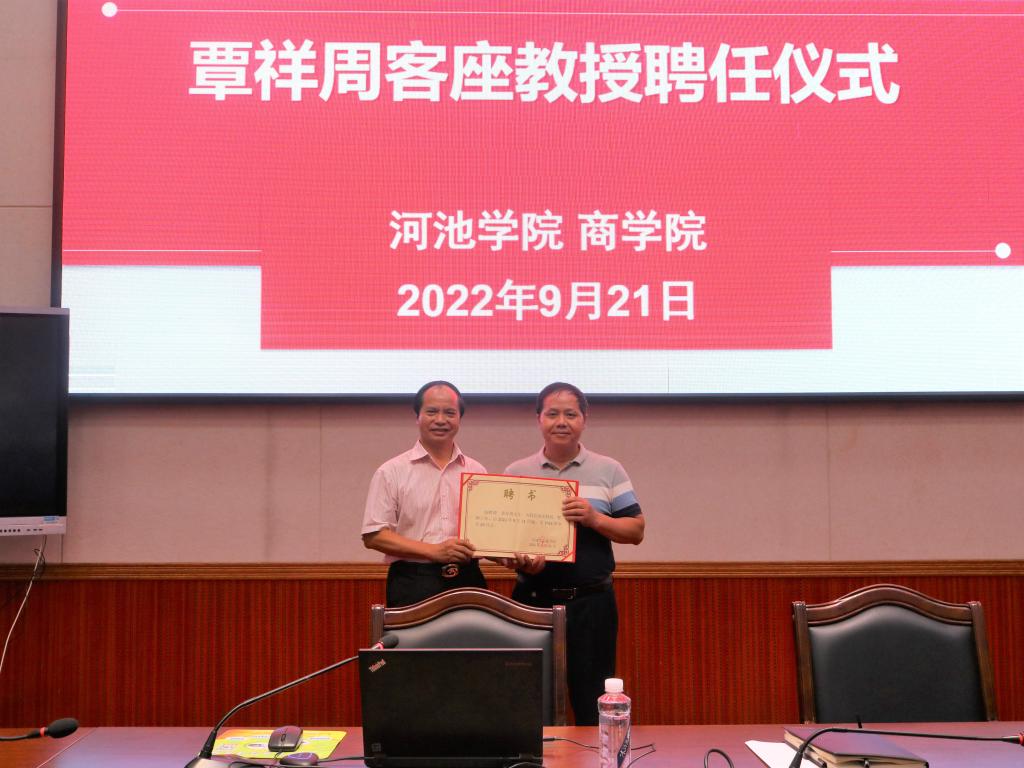 覃举东讲座前向覃祥周颁发必威西汉姆联官网客座教授聘书,指出覃祥周受聘为必威西汉姆联官网客座教授将加强学院教师队伍建设、推动学科专业建设和内涵发展具有推动意义。