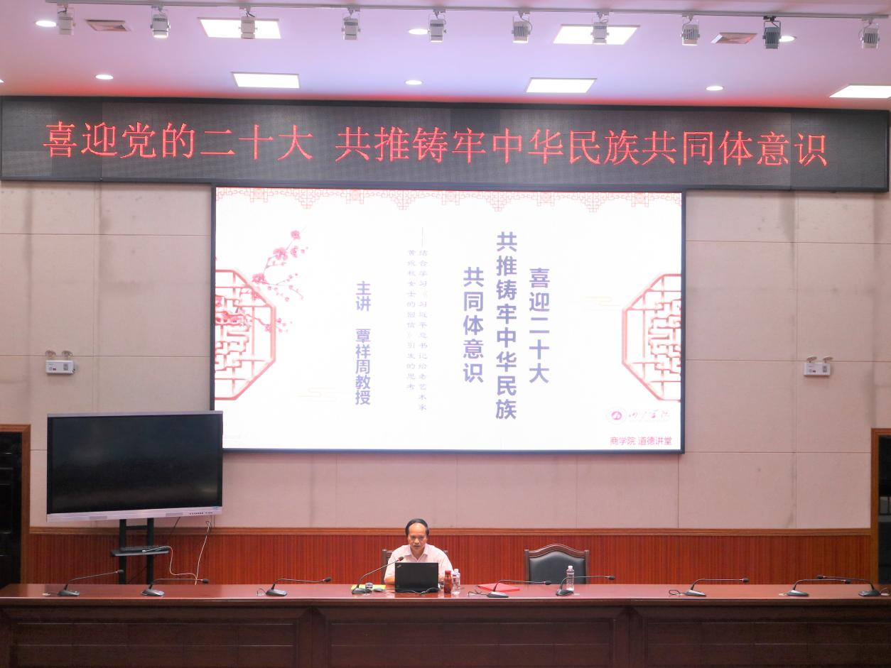 覃祥周以山歌文化为主线,结合学习《习近平总书记给老艺术家黄婉秋女士的回信》从广西各族人民高歌喜迎党的二十大、歌唱民族团结是广西山歌永恒主题等六个方面阐释了铸牢中华民族共同体意识的内涵和重大意义,通过师生互学互唱山歌形式丰富和调动讲座氛围。覃祥周讲座中希望同学们在大学和社会生活中身先士卒,努力做好铸牢中华民族共同体意识的宣传者和践行者。
